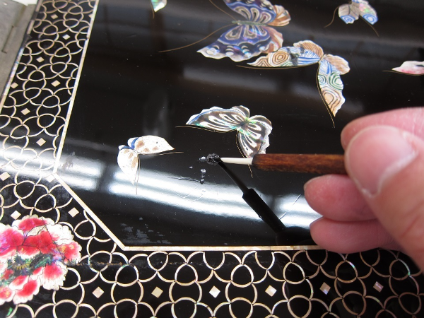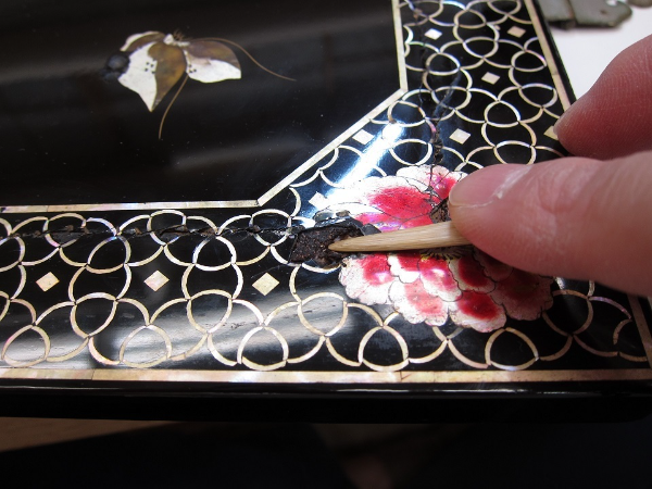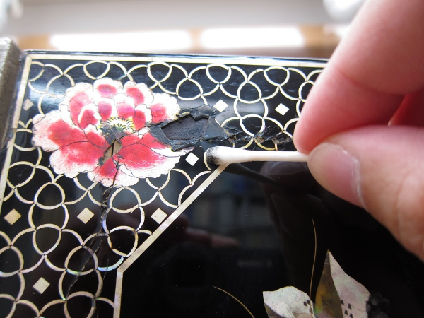 螺鈿の剥離部分に膠水を含浸