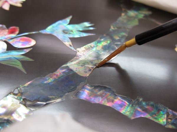 膠水を剥離している螺鈿(貝片)の下に流し込み、圧着固定を行って螺鈿を安定させました。
