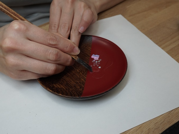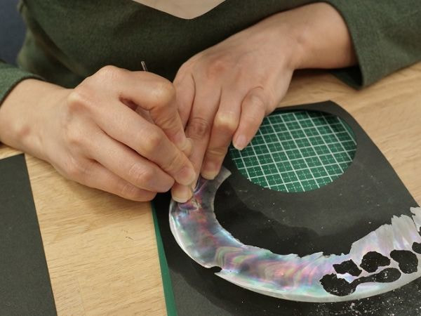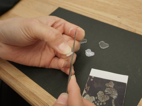 8.漆の乾燥(硬化)具合を見て、ヘラなどを使って貝片の上の漆塗膜を剥がします。