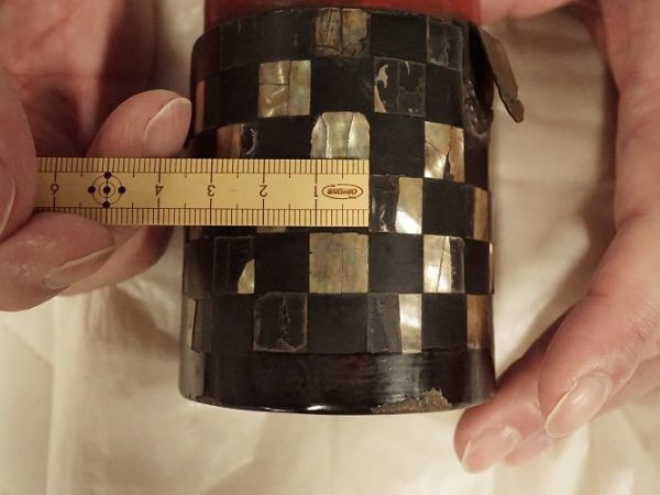 館蔵の螺鈿作品を数点拝見し、館のご担当者様と相談しながら原案を決め、採寸、写真撮影を行いました。
