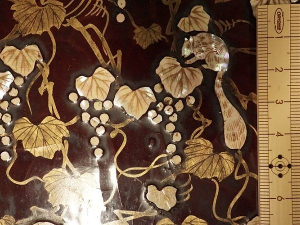 潤塗葡萄栗鼠螺鈿箔絵硯箱、一部拡大