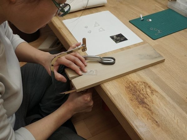 4.夜光貝を水で湿らせ、アクリルの型に沿って針でなぞり、型抜きをします。葡萄の実は穴あけポンチで押し抜きます。