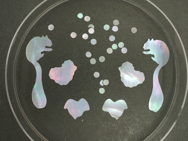 9.摺漆のみの側にも、同じように膠で貝片を貼り付けます。これにより貝の薄さや色の違い・透け感などが分かりやすくなります。