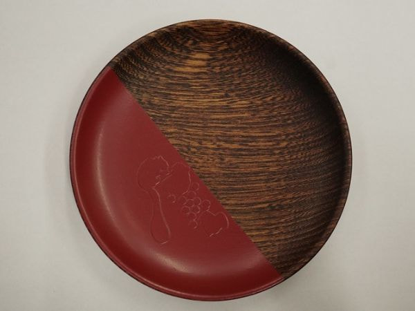 ・小皿:径12.0 cm(摺漆を数回重ねた後、1つは2/3程度を黒漆塗り、もう一つは1/3程度を朱漆塗り)