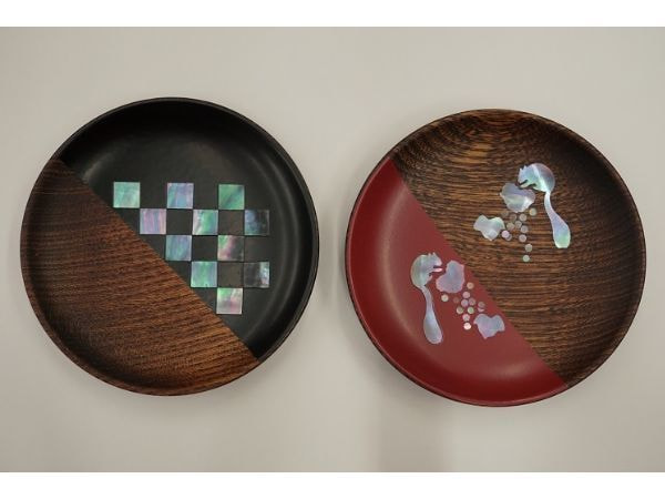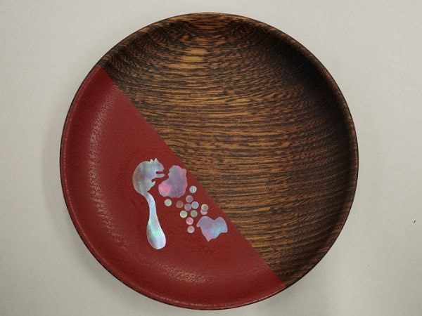 今回はその持ち出し教材用として、福岡市美術館所蔵の作品を原案に螺鈿の小皿を2点制作しました。