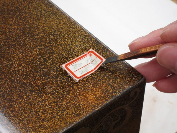 塗膜の強化と艶の回復のため、蓋、懸子、身で互いに擦れ合った部分に漆固めを行いました。