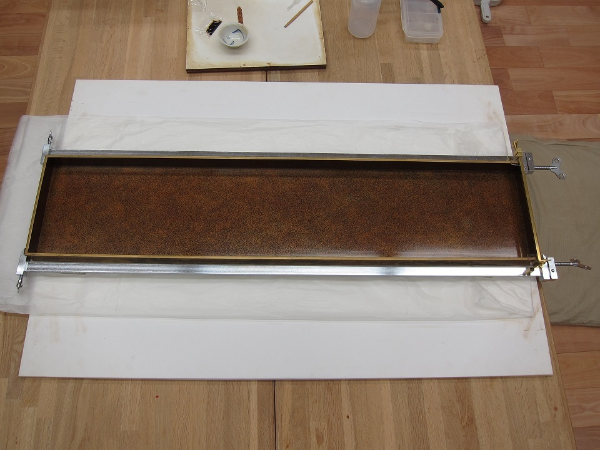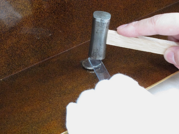 圧着固定にはハタガネを使用しました。作品に傷が付かないようゴム板を挟んで使用しています。