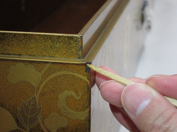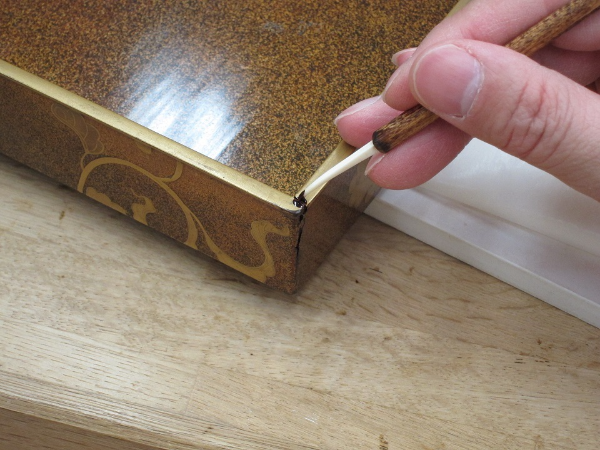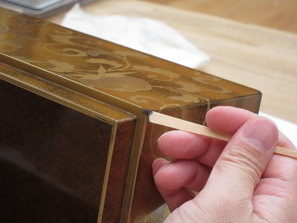 今回も、角の接合部分において隙間が生じていたため、充填接着に適した粘度の高い麦漆を溶剤で希釈して、亀裂から流し込み、接着をして安定させました。