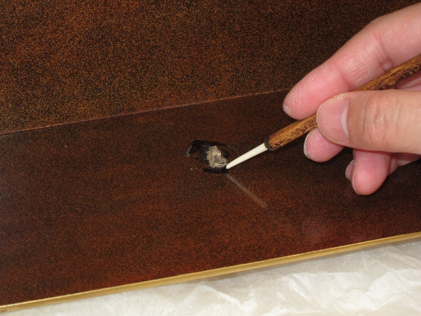 取り扱い時に引っかかりのないよう、欠損箇所とその周辺の塗膜(現状の最上面の塗膜)との段差を緩和するように漆下地を付けました。