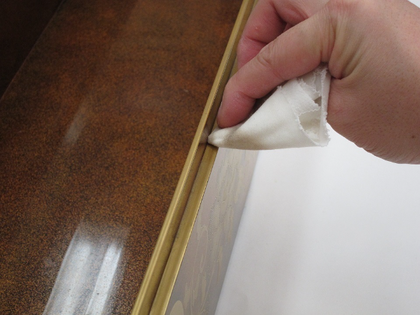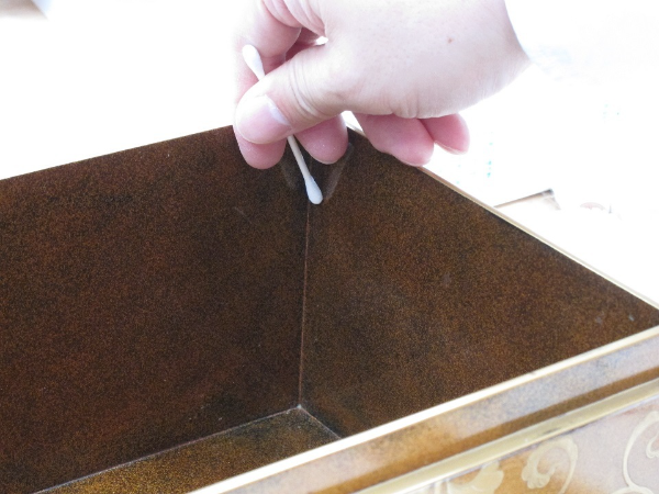 漆塗膜に付着しているカビ汚れなどは、手触りの柔らかい木綿布に極少量の水を含ませて少しずつ拭きとり、除去しました。