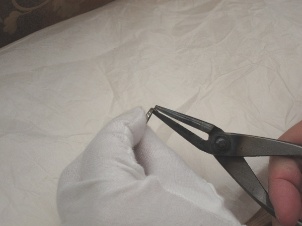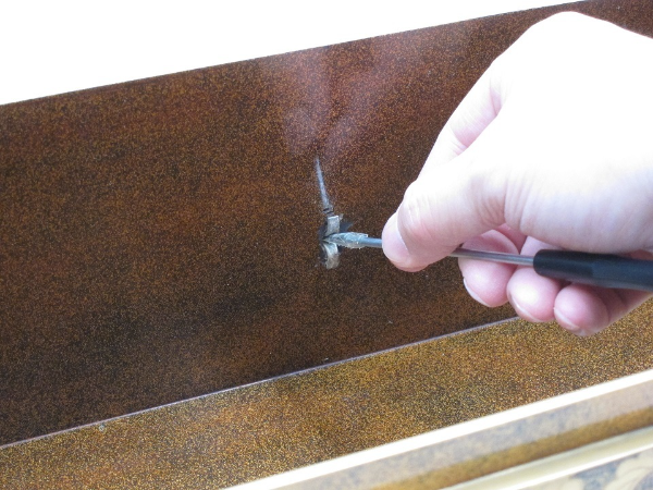 脱落していた覆金具は爪が僅かに内向きに曲がっていたため、外側に広げ直し、元の爪穴を活かして同じ位置に打ち直しました。